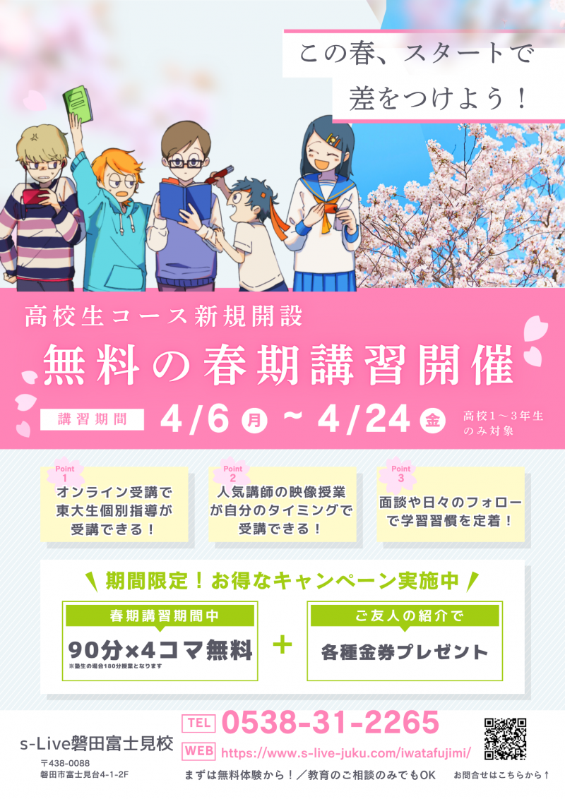 s‐Live 磐田富士見校では高校生コースの春期講習を開催いたします!