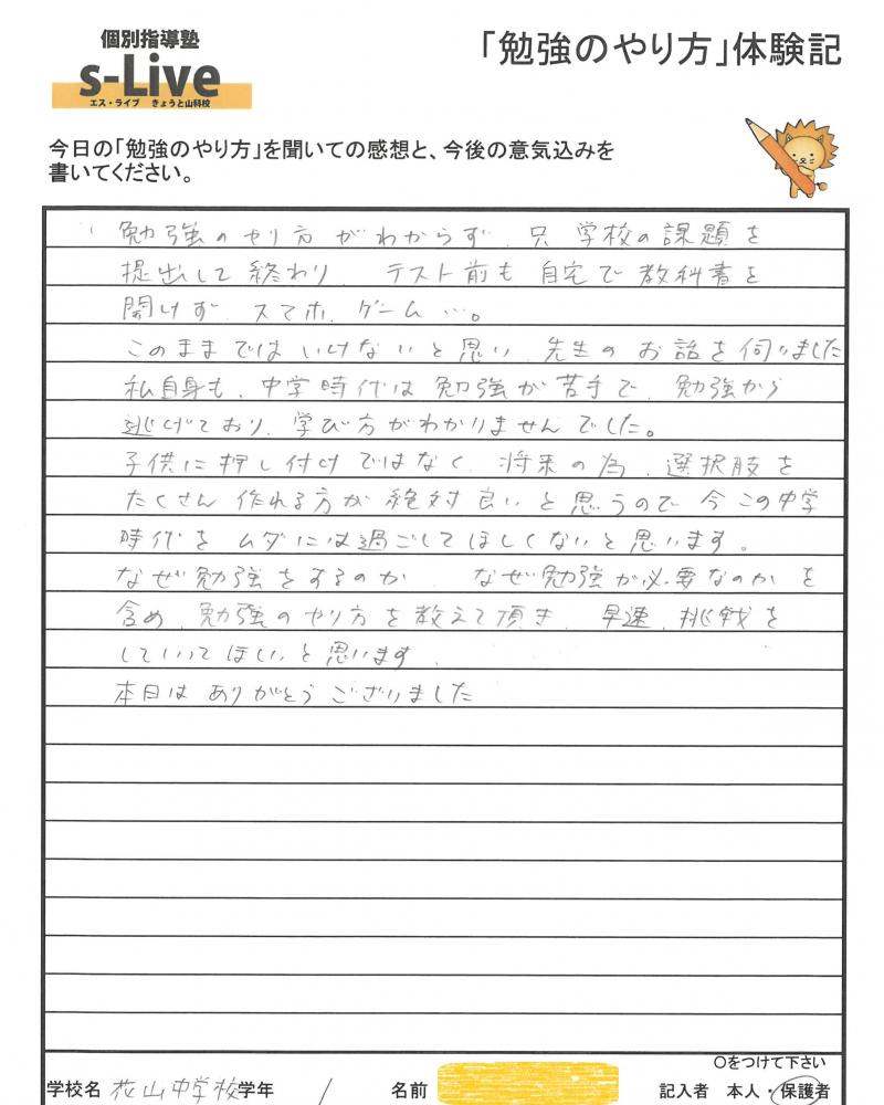 花山中学校1年生 Wさん 記入者:本人