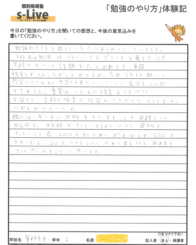 予習と復習も大事と話していたので、今回学んだ事を大切にして中学校生活を すごしたいです。