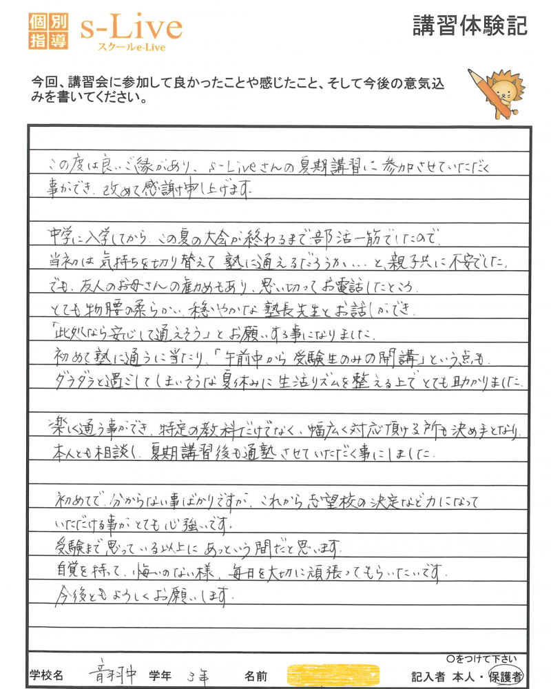 s-Liveさんの夏期講習に参加させていただく事ができ、改めて感謝申し上げます。
