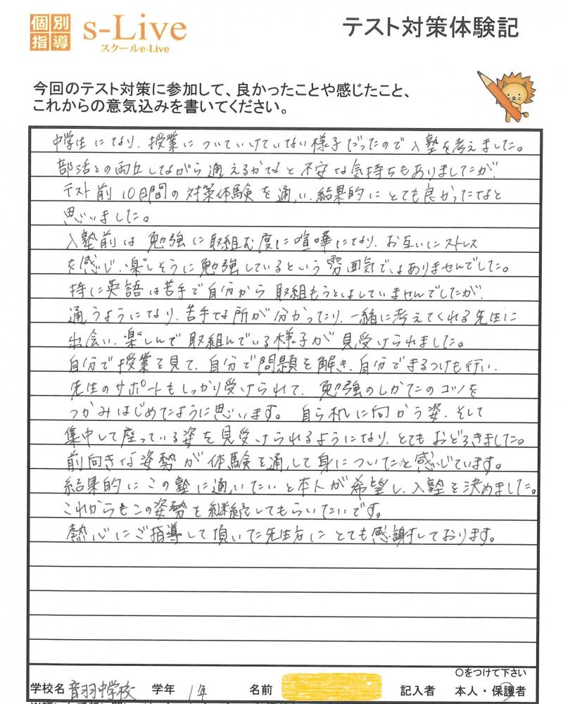先生のサポートもしっかり受けられて、勉強のしかたのコツをつかみはじめたように思います。